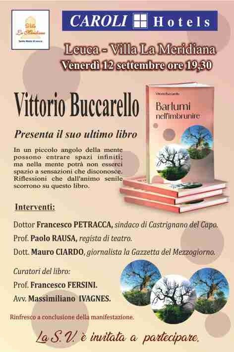 La raccolta di poesie di Vittorio Buccarello Vittorio Buccarello presenta a Villa La Meridiana la sua ultima raccolta di poesie, «Barlumi nell’imbrunire» (Youcanprint). Grazie a un’iniziativa promossa da Caroli Hotel. Interverranno il sindaco di Castrignano del Capo Francesco Petracca, il regista teatrale Stefano Rausa, il giornalista della Gazzetta del Mezzogiorno Mauro Ciardo e i curatori del libro Francesco Fersini e Massimiliano Ivagnes. 12/09/25