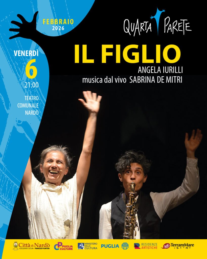Prosegue la 16ª Stagione del Teatro Comunale di Nardò (Le). Venerdì 6 febbraio 2026 alle ore 21:00 un nuovo appuntamento della rassegna QUARTA PARETE dedicata al teatro contemporaneo. In scena Angela Iurilli con IL FIGLIO. Tratto dal romanzo Il figlio di due madri di Massimo Bontempelli, maestro del realismo magico italiano, lo spettacolo è un invito alla riflessione, all’ascolto e alla riscoperta del potere immaginifico del teatro e della letteratura.