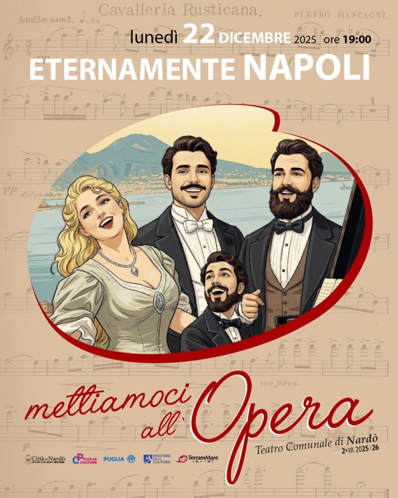 Domani, lunedì 22 dicembre, a Nardò (Le), per la 16ª Stagione teatrale del Teatro Comunale, frutto della collaborazione tra il Comune di Nardò e Puglia Culture con TerramMare Teatro, torna in scena la rassegna Mettiamoci all’Opera, sezione di concerti lirico-musicali dedicata quest’anno al compositore Pietro Mascagni. In questo secondo appuntamento è la volta di Opera Mia – Napoli Opera House, con Maria Luisa Lattante, Enrico Guerra, Luca De Lorenzo, Ekland Hasa in Eternamente Napoli. Un concerto narrato che celebra la canzone classica napoletana, tracciando un affresco sonoro e poetico lungo due secoli di storia.