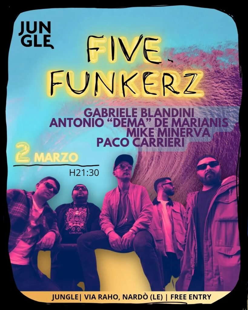 Band formata da alcuni tra i musicisti più attivi nel panorama salentino e impegnati in numerose collaborazioni con artisti di fama nazionale ed internazionale; i Five Funkerz propongono un repertorio che omaggia le nuove sonorità funk, jazz e new-soul!