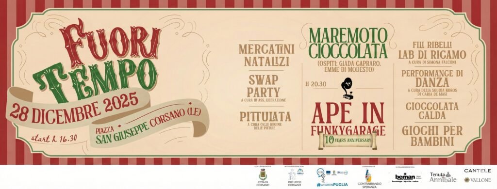 Il 28 Dicembre a Corsano (Piazze S.Giuseppe e S.Teresa) Contrabbando Speranza è felice di invitarti alla 5° edizione di FUORITEMPO – Confini off.
