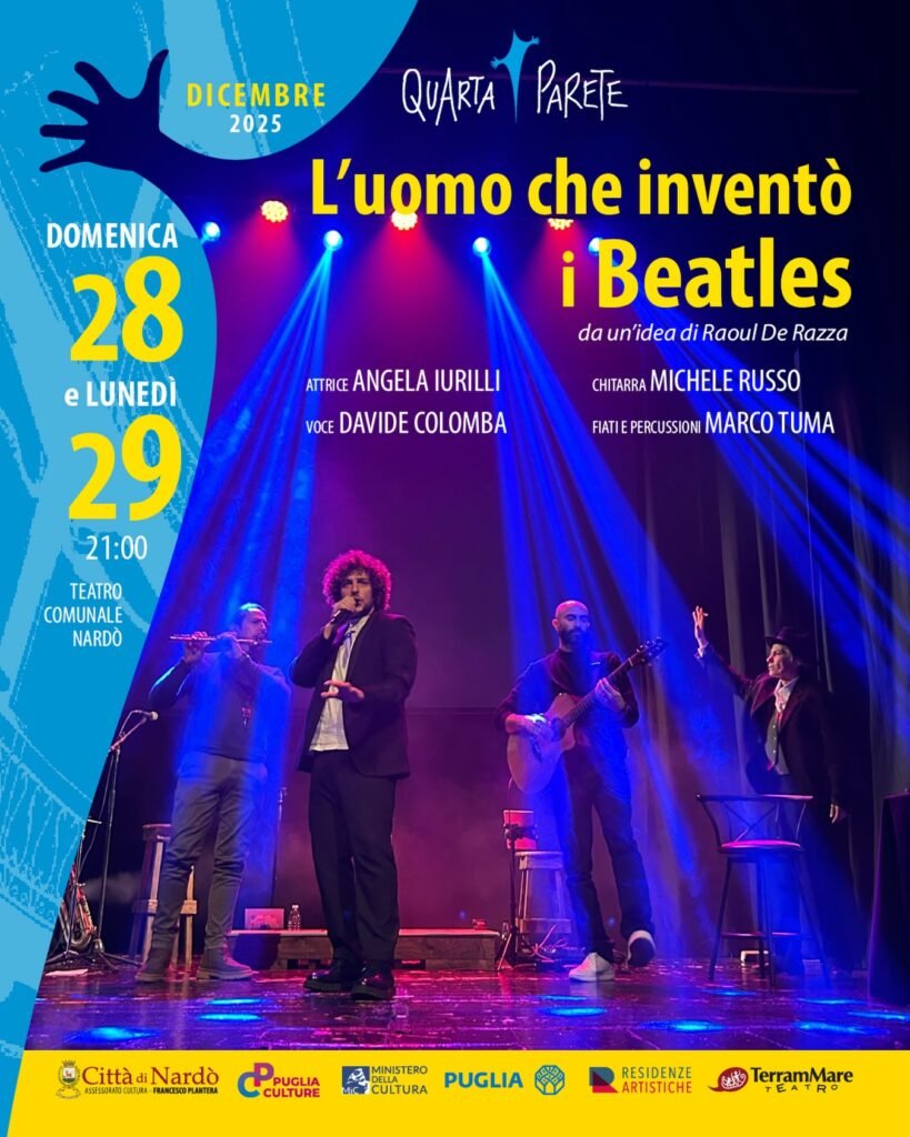 Il 2025 della 16ª Stagione teatrale del Teatro Comunale di Nardò si chiude con gli appuntamenti di domenica 28 e lunedì 29 dicembre, ore 21. Ancora una messinscena per la rassegna di teatro contemporaneo Quarta Parete che esplora linguaggi decisamente nuovi della scena più attualeQuesta voltaTerramMare Teatro presentaL’uomo che inventò i Beatles, per la regia di Silvia Civilla: è la storia di Brian Epstein, il manager che consegnò i Fab Four alla fama mondiale.