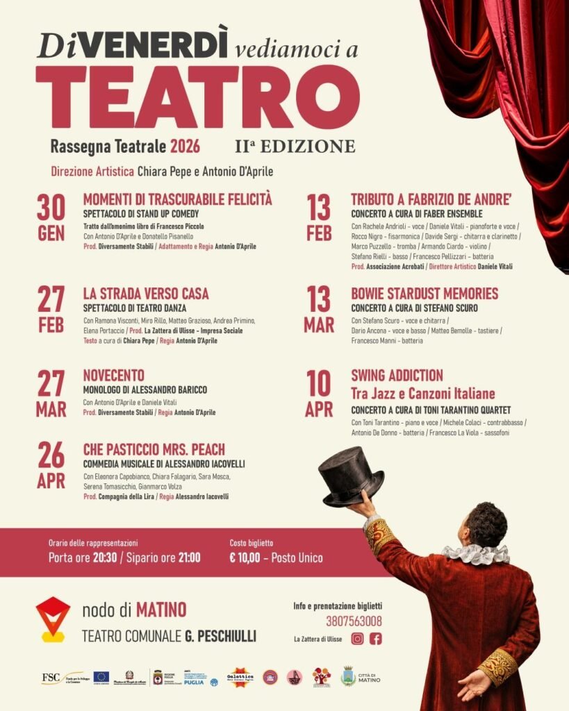 “Di Venerdì… Vediamoci a Teatro “, seconda edizione. Un cartellone di sette appuntamenti, tra teatro e musica, per un viaggio tra generi e stili diversi. Vi aspettiamo presso il Teatro Comunale di Matino, a partire dal 30 gennaio!