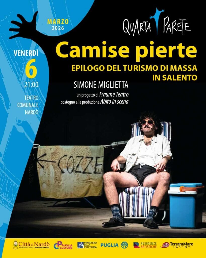 È la volta di Simone Miglietta con il suo “Camise Pierte – Epilogo del turismo di massa in Salento” sul palco della 16ª Stagione teatrale del Teatro Comunale di Nardò (LE). L’appuntamento riguarda in particolare la sezione di teatro contemporaneo “Quarta Parete”, che esplora linguaggi decisamente nuovi della scena più attuale, edè per venerdì 6 marzo alle ore 21:00. Riflettori accesi sul progetto di FRAUME TEATRO, con il sostegno alla produzione di ABITO IN SCENA, scritto, diretto e interpretato da Simone Miglietta (materiale d’inchiesta a cura Marilù Mastrogiovanni, supervisione artistica di Licia Lanera e Danilo Giuva).