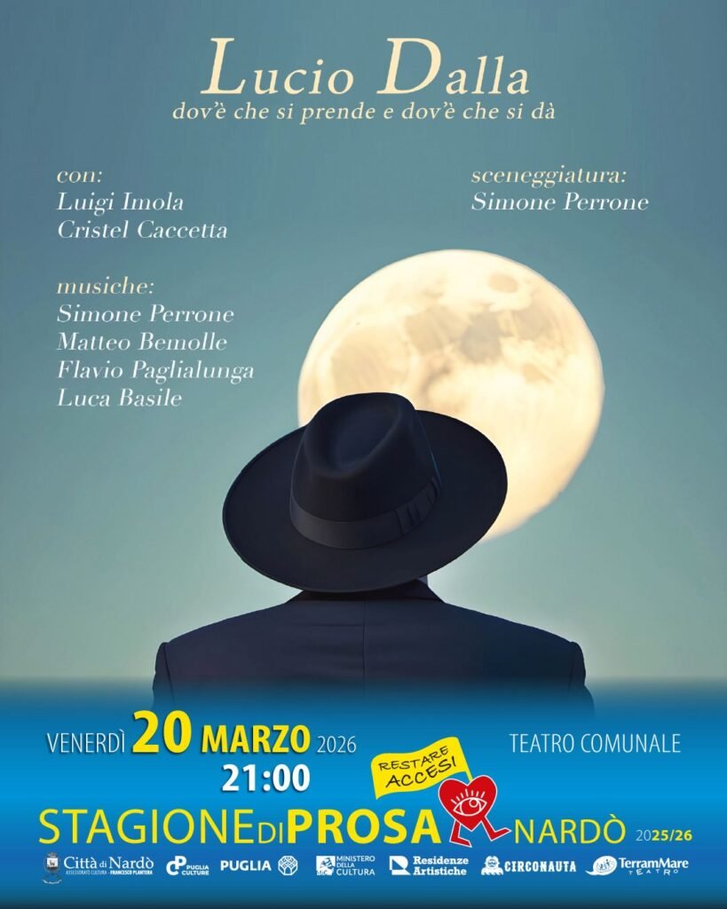 È dedicato a Lucio Dalla il prossimo appuntamento della 16ª Stagione teatrale del Teatro Comunale di Nardò (LE), venerdì 20 marzo alle ore 21:00. In scena Simone Perrone, che firma anche drammaturgia e regia di “Lucio Dalla: dov’è che si prende e dov’è che si dà”.