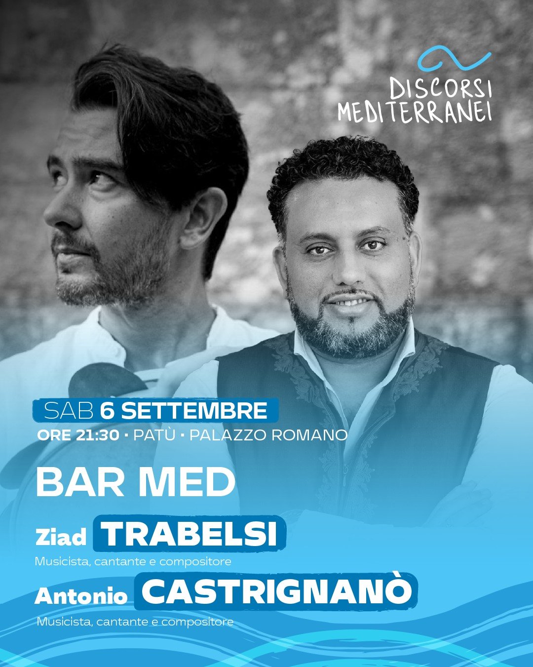 Il 𝟲 𝘀𝗲𝘁𝘁𝗲𝗺𝗯𝗿𝗲, a Patù, Discorsi Mediterranei ospiterà 𝗕𝗔𝗥 𝗠𝗘𝗗, progetto musicale nato dalla collaborazione tra Antonio Castrignanò e Ziad Trabelsi 𝗕𝗔𝗥 𝗠𝗘𝗗 è un incontro tra il Sud dell’Italia e il Nord dell’Africa, tra Oriente e Occidente. Un viaggio tra identità e memoria attraverso brani strumentali e canzoni originali che si rifanno a sonorità mediterranee, afro, […]