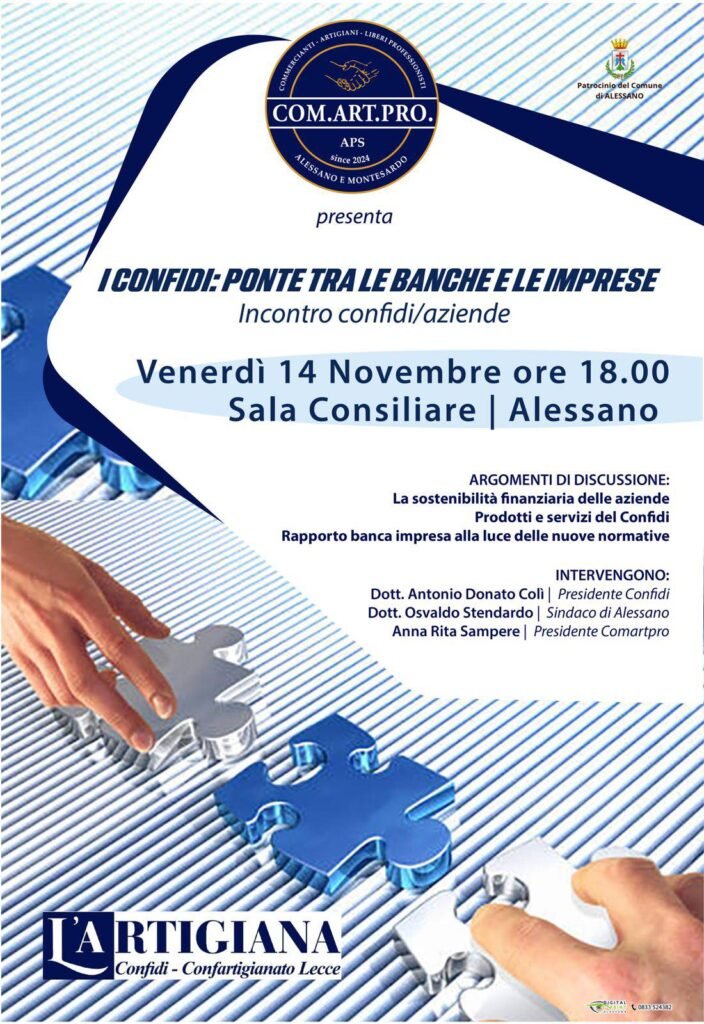 Venerdì 14 novembre presso la sala consiliare del Comune di Alessano, l’associazione Com.Art.Pro. Aps invita tutti gli iscritti a un incontro con L’Artigiana, il Confidi di Confartigianato Lecce. Argomenti in Discussione. – La sostenibilità finanziaria delle aziende – Prodotti e servizi offerti dal Confidi – Il rapporto banca-impresa alla luce delle nuove normative Un’opportunità unica per approfondire tematiche cruciali e fare rete! 14/11/2025